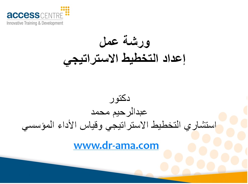 ورشة عمل إعداد التخطيط الإستراتيجي 15 ما يو 2013 فندق جراند حياة – الدوحة الدكتور عبدالرحيم محمد إستشاري التخطيط الإسترتيجي وقياس الأداء المؤسسي *protected email* ناقشت الورشة كيفية إعداد الخطة الإستراتيجية إبتداء من التحضير للتخطيط وعمل التحليل البيئي وصياغة الرؤية والرسالة والقيم وإنتهاء بتحديد الأهداف الإستراتيجية المادة: ورشة إعداد التخطيط الإستراتجي